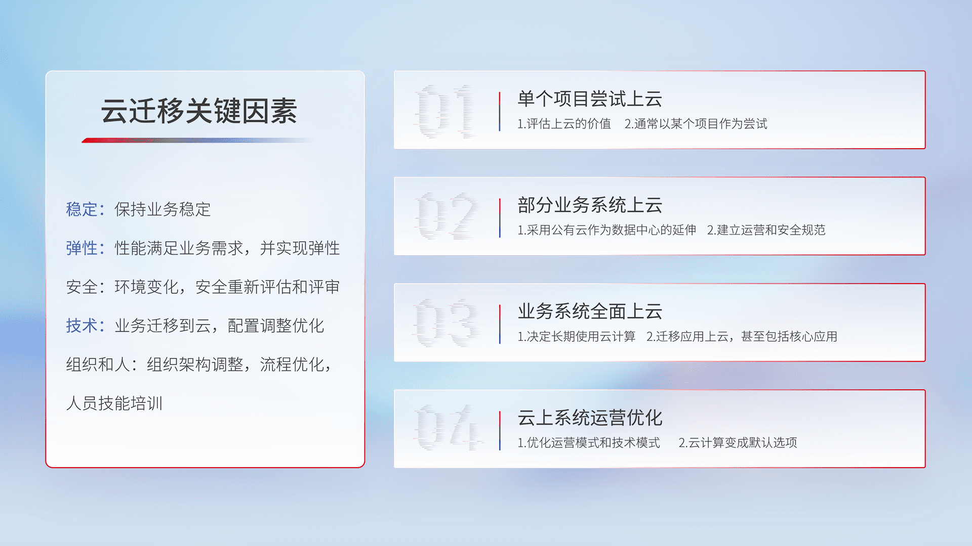 结合实际业务,,,,从规划设计、、云平台选型、、云原生改造、、数据迁移、、、、集成交付,,,,迁移全过程为客户识别最佳上云路径,,做好风险识别管理,,,,设计网络架构、、、身份权限、、、安全审计合规、、、操作审计、、、、日志审计、、、、监控告警策略、、多站点容灾设计等,,,对云上基础设施进行整体规划,,提升IT治理水平,,,以满足弹性、、、高可用、、、、高性能的需求。。。。