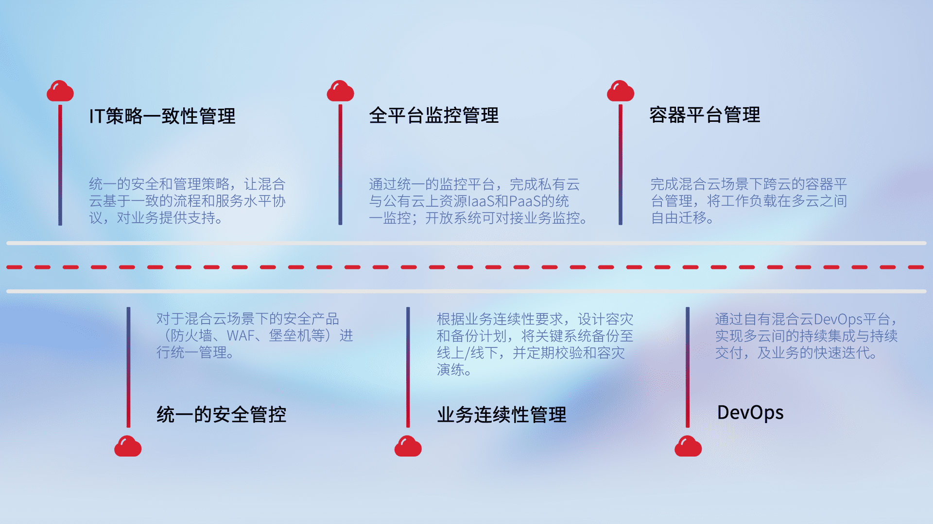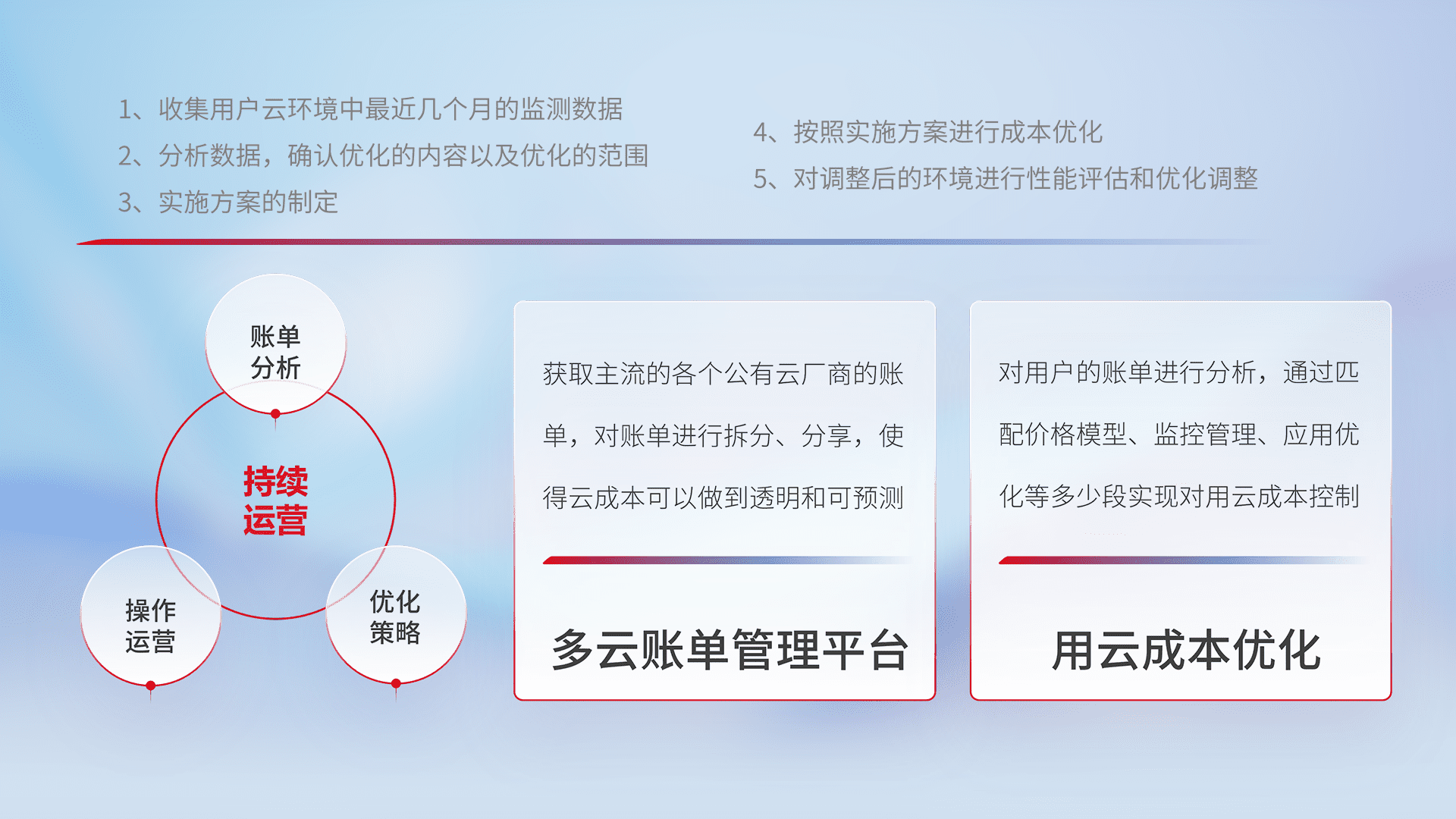 通过多云纳管,,,,以统一的资源数据模型把客户的云资源进行抽象和封装,,进而实现对多云资源的统一操作,,保障云资源管理的可靠性、、、稳定性与可用性。。量身定制化运维内容,,,配置、、、、开发运维、、补丁管理、、、、备份、、、监控、、认证和访问管理、、、、审计和日常巡检等,,保障在用云过程中的可靠度,,,,稳定度以及高可用率。。。
