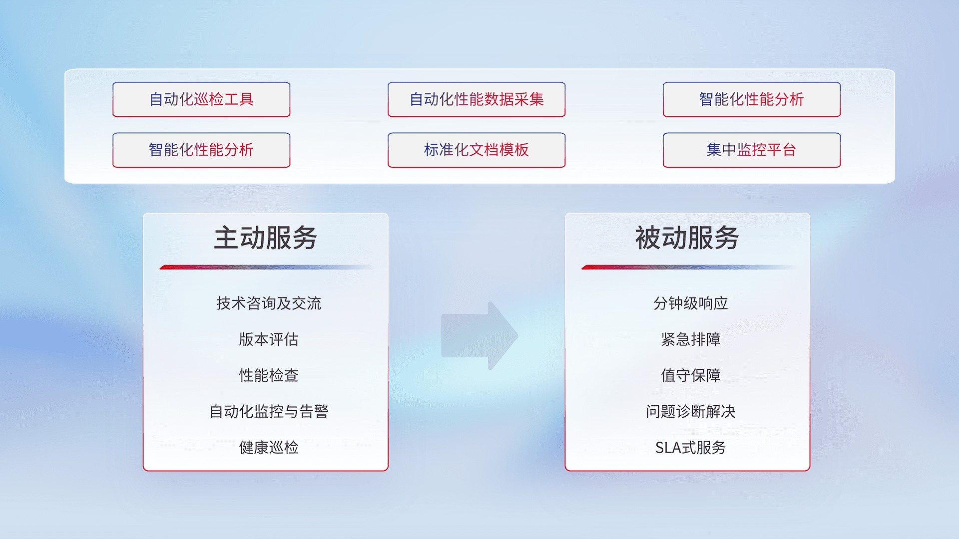 智能化工具和标准化文档,,,保障服务质量,,,,提供主动服务(包含技术咨询、、、版本评估、、、性能检查、、、自动化监控与告警、、、、健康巡检)和被动服务包含(分钟级响应、、紧急排障、、值守保障、、问题诊断解决、、SLA服务)。。